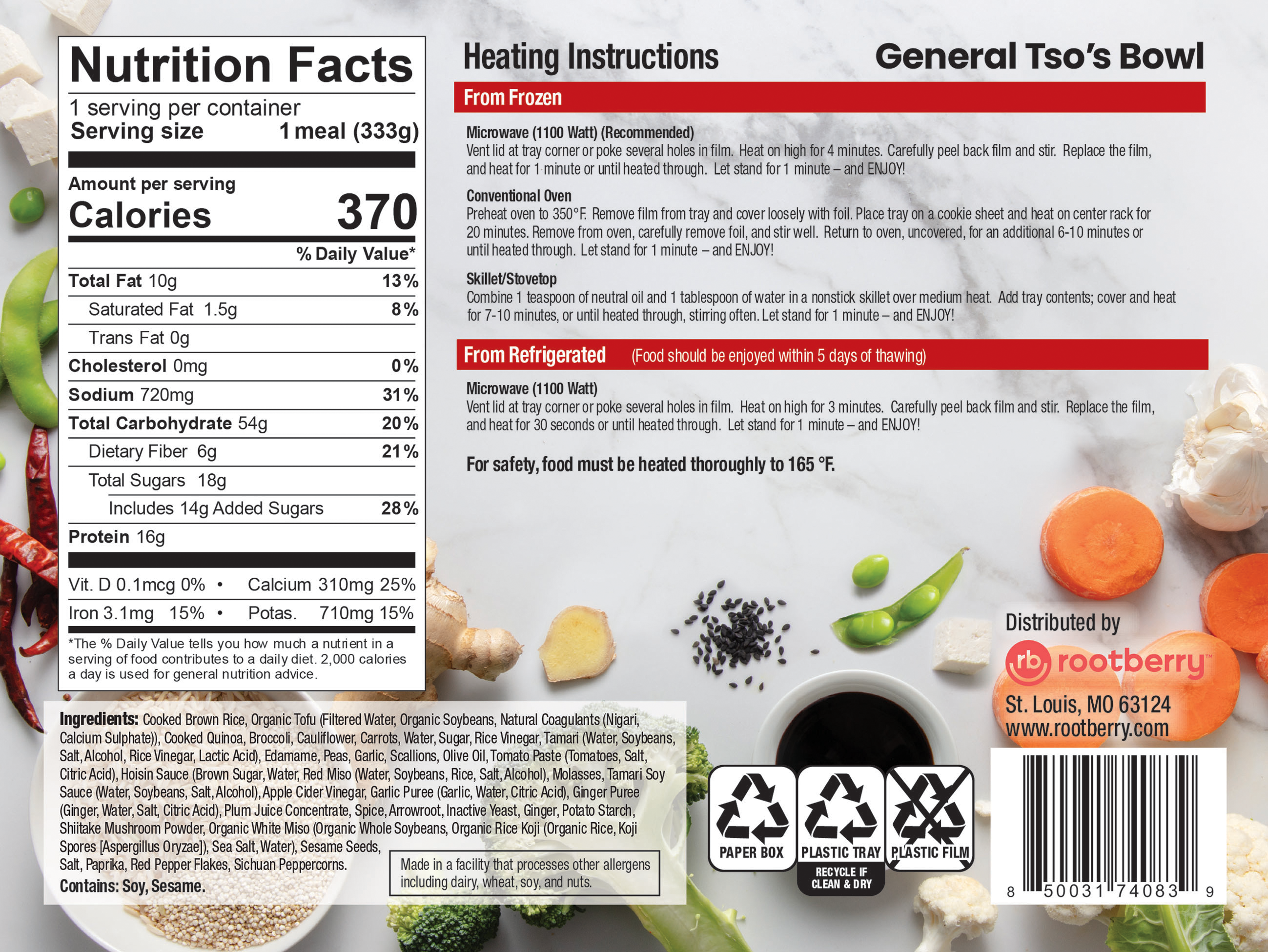Cooked Brown Rice, Organic Tofu (Filtered Water, Organic Soybeans, Natural Coagulants (Nigari, Calcium Sulphate)), Cooked Quinoa, Broccoli, Cauliflower, Carrots, Water, Sugar, Rice Vinegar, Tamari (Water, Soybeans, Salt, Alcohol, Rice Vinegar, Lactic Acid), Edamame, Peas, Garlic, Scallions, Olive Oil, Tomato Paste (Tomatoes, Salt, Citric Acid), Hoisin Sauce (Brown Sugar, Water, Red Miso (Water, Soybeans, Rice, Salt, Alcohol), Molasses, Tamari Soy Sauce (Water, Soybeans, Salt, Alcohol), Apple Cider Vinegar, Garlic Puree (Garlic, Water, Citric Acid), Ginger Puree (Ginger, Water, Salt, Citric Acid), Plum Juice Concentrate, Spice, Arrowroot, Inactive Yeast, Ginger, Potato Starch, Shiitake Mushroom Powder, Organic White Miso (Organic Whole Soybeans, Organic Rice Koji (Organic Rice, Koji Spores [Aspergillus Oryzae]), Sea Salt, Water), Sesame Seeds, Salt, Paprika, Red Pepper Flakes, Sichuan Peppercorns.