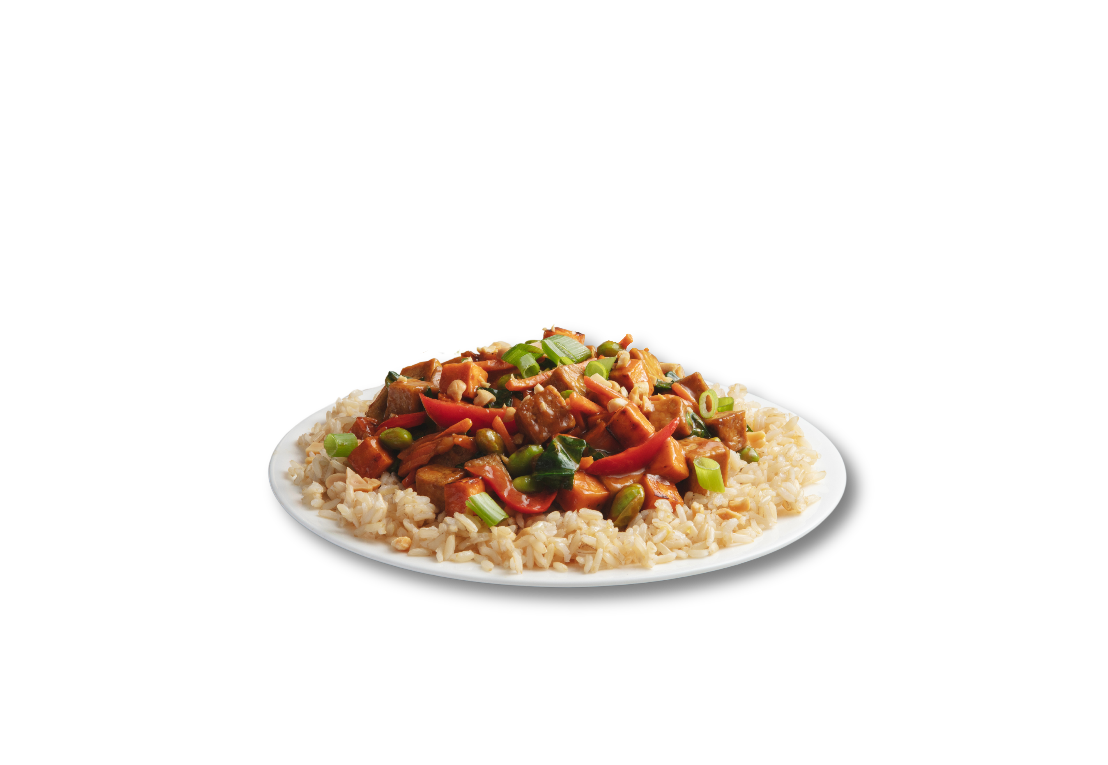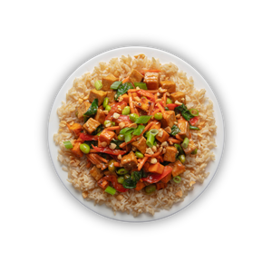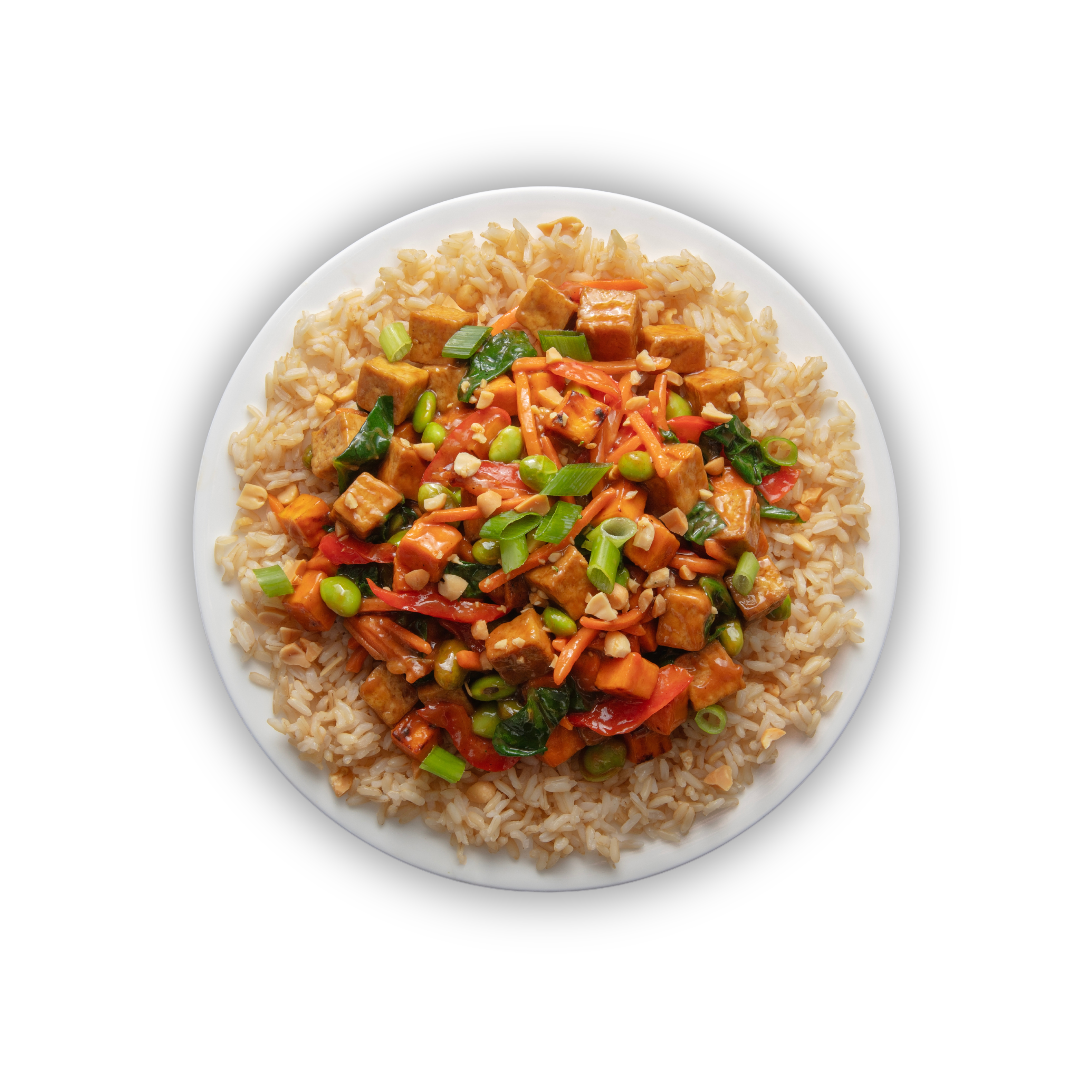 Tender organic tofu and crisp vegetables are tossed in a rich, creamy peanut sauce made with real peanut butter, tamari, and a hint of sweet chili heat. Served over fluffy jasmine rice with crunchy peanuts on top, this meal is comfort food at its finest.